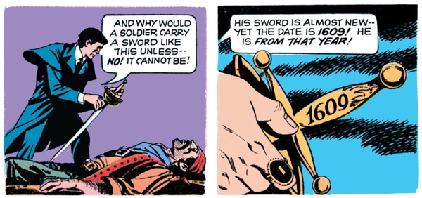 Barnabas wonders why the guy is dressed in such antique clothes, but on further inspection/looting the corpse, he finds a cutlass with the numbers 1609 inscribed into the hilt. He makes the leap of logic to presume that the pirate comes from that year, because obviously if you’re a pirate you’re going to keep your sword hilt up to date.