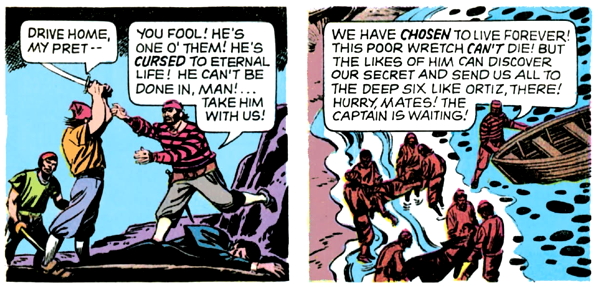 So it seems there are two different classes of people who have eternal life: the cursed immortals like Barnabas, who is visible but cannot be destroyed in any way, and the intentional immortals like the pirates, who are invisible but can be killed by Barnabas, or each other. Does everybody have that straight now? Good.