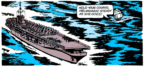 Then there’s a gag that I think is legit amusing, with the pirate crew wanting to attack a boat and the captain saying it’s not a good idea, and it turns out in the next panel that it’s an aircraft carrier. I don’t have anything to say about it, but this comic almost never tries to be openly funny, so I want to show some respect.