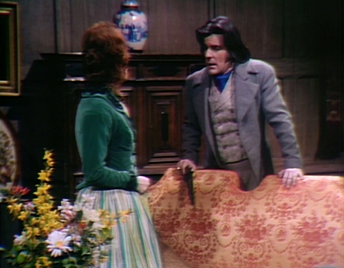 8. My favorite sword moment in Dark Shadows is when Quentin pulls a big one out of its wall-mounted mounted sheath and brings the curtains, the rod, and a lamp (fortunately not the Ralston Purina) crashing down behind him while keeping an absolutely straight face. A keeper. (Will you be choosing your favorite goof on April 2–or is that too disrespectful?)