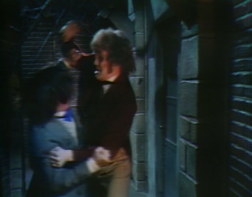 Then there’s the big tussle, which we glimpse through an assortment of rubbish that happens to be in the area. Gabriel lunges with his knife, and Morgan grabs his wrists, and they push each other about a bit, and then Morgan makes Gabriel drop the knife, and Gabriel gives Morgan a well-telegraphed uppercut, which sends him sprawling backwards.